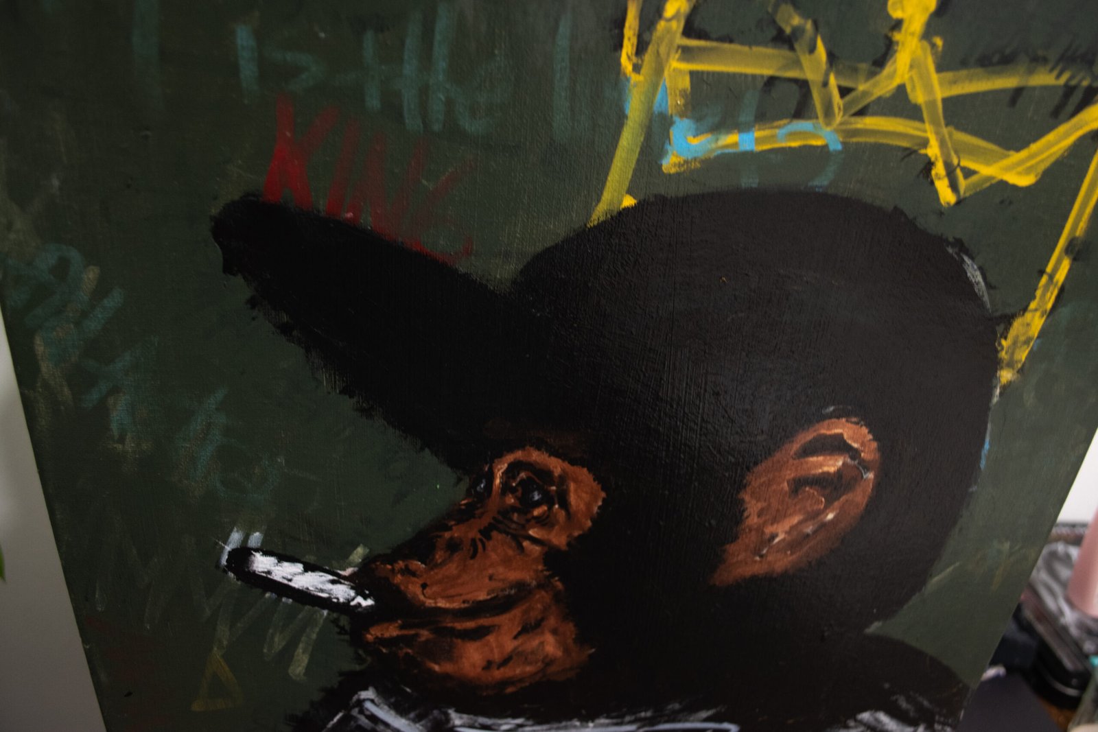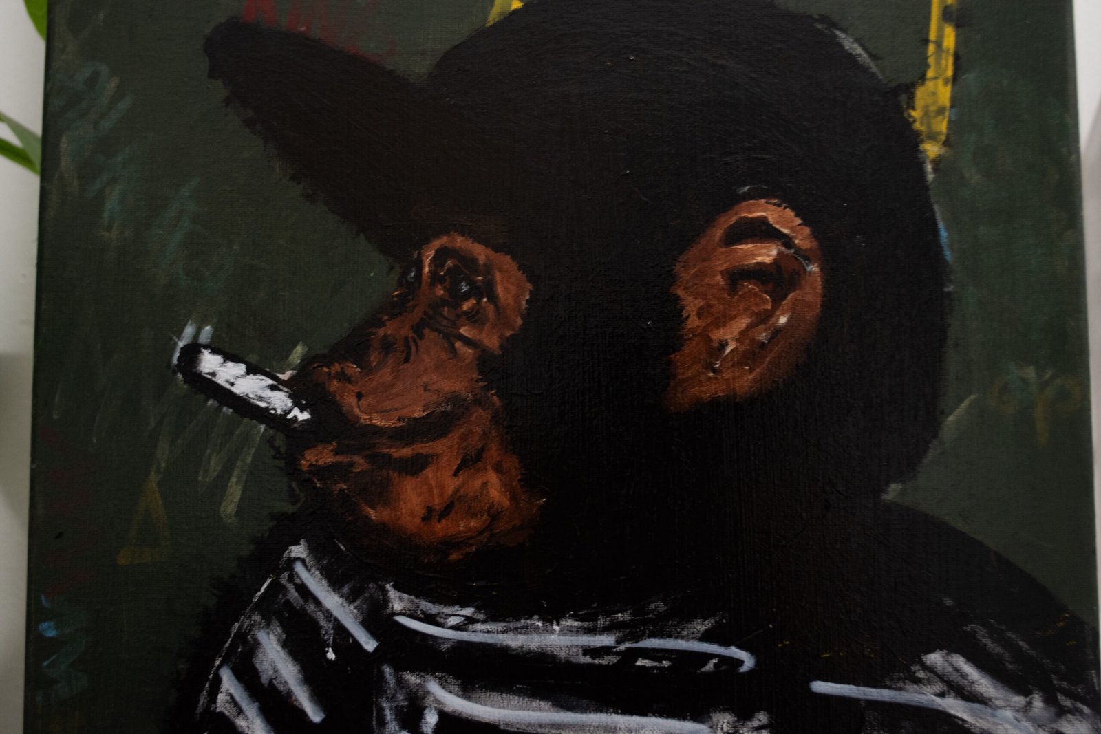 Executed with a stark, expressionistic technique and a subdued color palette, the artwork focuses on the intimate details of a primate, holding a cigarette—a stark symbol of human vice and contemplation. The heavy brushwork and dark background amplify the sense of isolation and introspection, questioning humanity’s place and legacy.